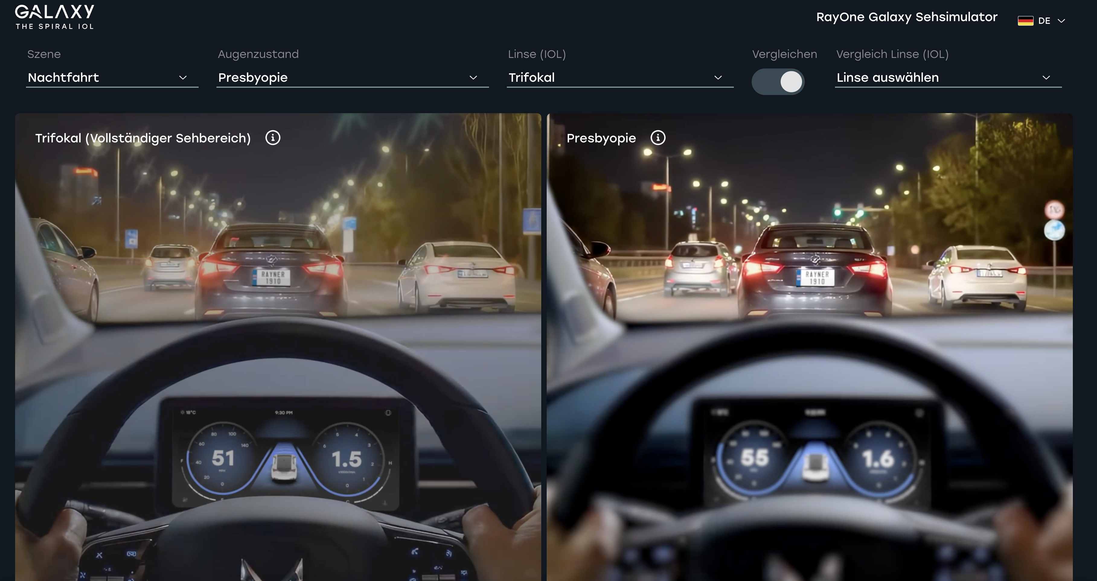 | Nachdem Sie die Option "Vergleichen" ausgewählt haben, können Sie zwei Linsentypen gegenüberstellen und das optische Ergebnis vergleichen. |