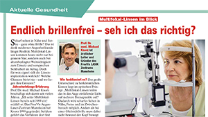 Als Alternative zu Lese- oder Gleitsichtbrille hat sich in der refraktiven Linsenchirurgie der Austausch der eigenen Linse durch Multifokallinsen etabliert. Multifokallinsen brechen das Licht in mehrere Brennpunkte und ermöglichen so das Sehen in unterschiedlichen Entfernungen ohne Brillenkorrektur. Professor Michael C. Knorz, Gründer und ärztlicher Leiter des FreeVis LASIK Zentrums Mannheim, implantiert Kunstlinsen seit über 30 Jahren erfolgreich. Das Magazin STERN zählt ihn zu „Deutschlands ausgezeichneten Ärzten 2023“. Vom FOCUS wurde er erneut zum „Top-Mediziner 2023“ im Bereich Refraktiver Chirurgie und Katarakt gewählt. » Weiter (PDF) - Oktober 2023