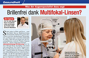 Viele ältere Menschen wünschen sich ein brillenfreies Leben. Das Einsetzen moderner Multifokallinsen kann hierbei helfen. Professor Knorz, Gründer und ärztlicher Leiter des FreeVis LASIK Zentrum Mannheim, implantiert diese Linsen seit über zwanzig Jahren erfolgreich. 2022 wurde der Mediziner erneut in der FOCUS-Ärzteliste zum Top-Experten im Bereich Refraktive Chirurgie und Katarakt gewählt. » Weiter (PDF) - September 2022